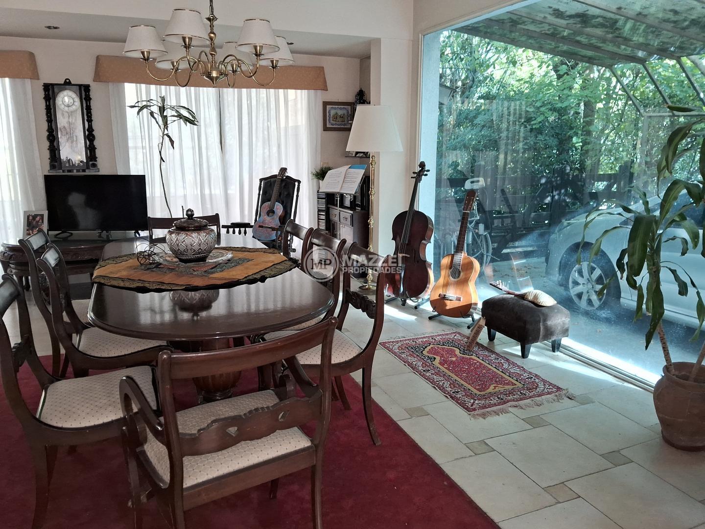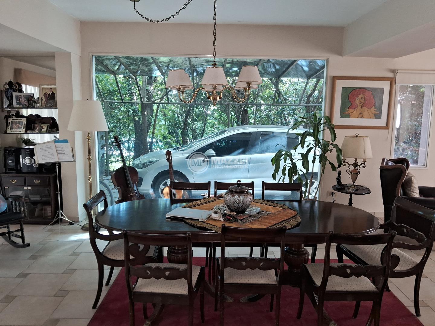 Comedor con doble circulación, cocina comedor diario con barra desayunadora, modular exhibidor de techo a piso con puertas y estantes, vista al jardín.