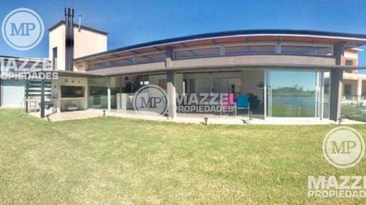 Living con hogar, comedor y cocina completa, integrados con barra desayunadora. Tres dormitorios, el principal en suite con vista al lago. Baño.
