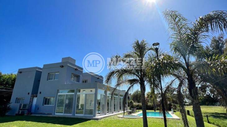 Exterior: Quincho de 70 m2 con vista al golf totalmente cubierto y con puertas ventana corredizas, cada una con mosquitero; parrilla, anafe , ventiladores de techo modernos, calefacción por piso radiante, baño. Piscina climatizada de 8 x 4 mts con playa húmeda revestida con venecitas con iluminación, mas jacuzzi y ducha . Fondo libre, riego automático. Grupo electrógeno de 14 HP a gas. Parquización con grama bahiana.