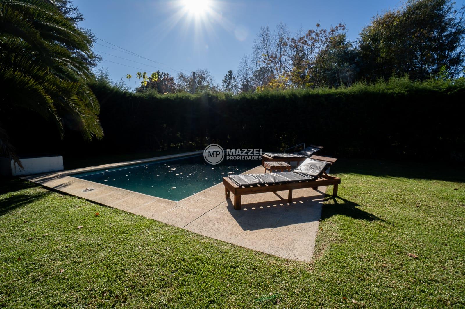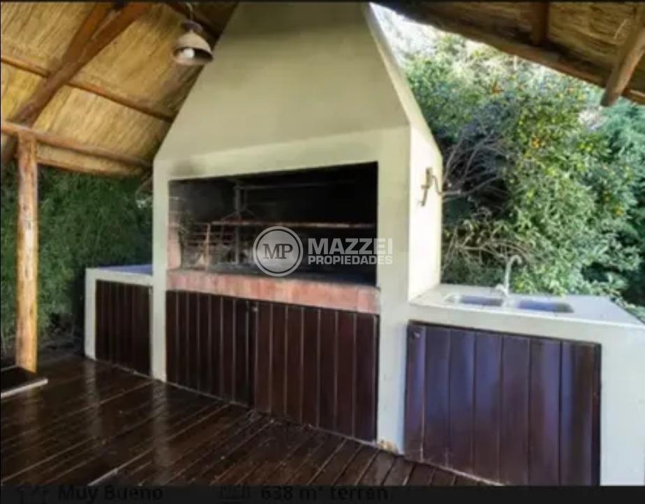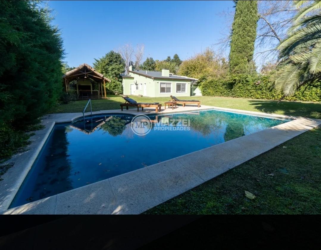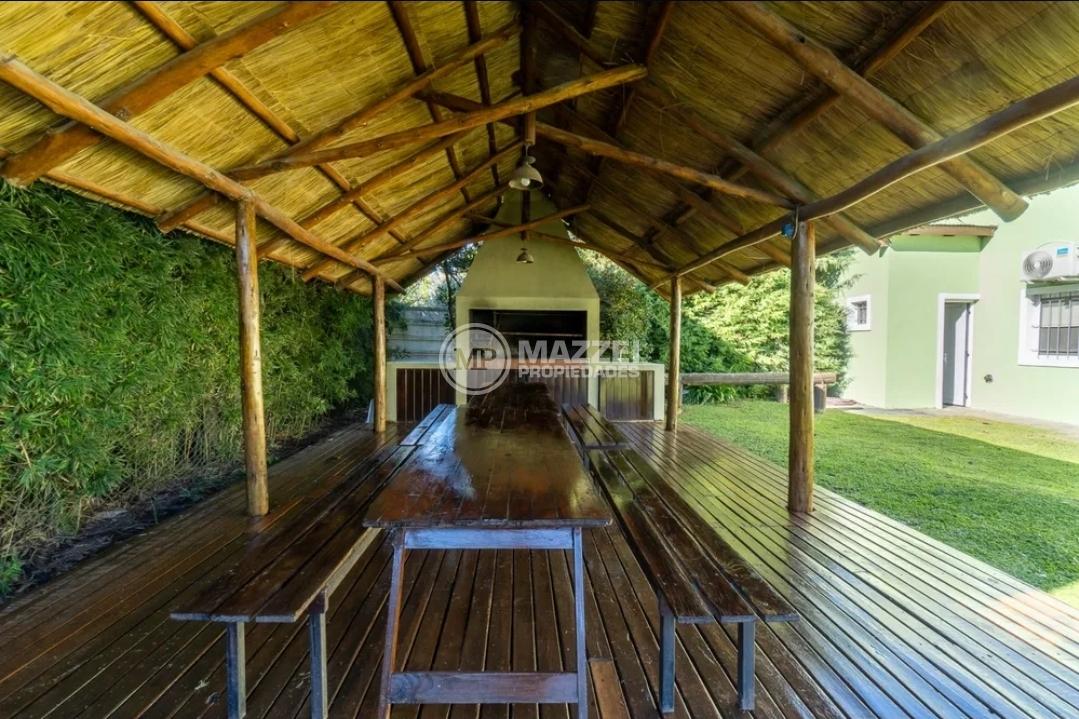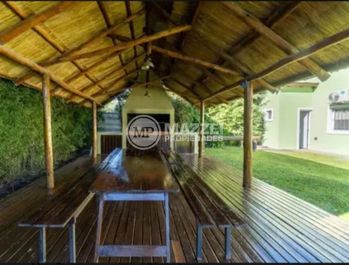 En el exterior, quincho amplio con mesa y bancos de madera, piso de deck. Piscina con bomba, filtro, solárium.