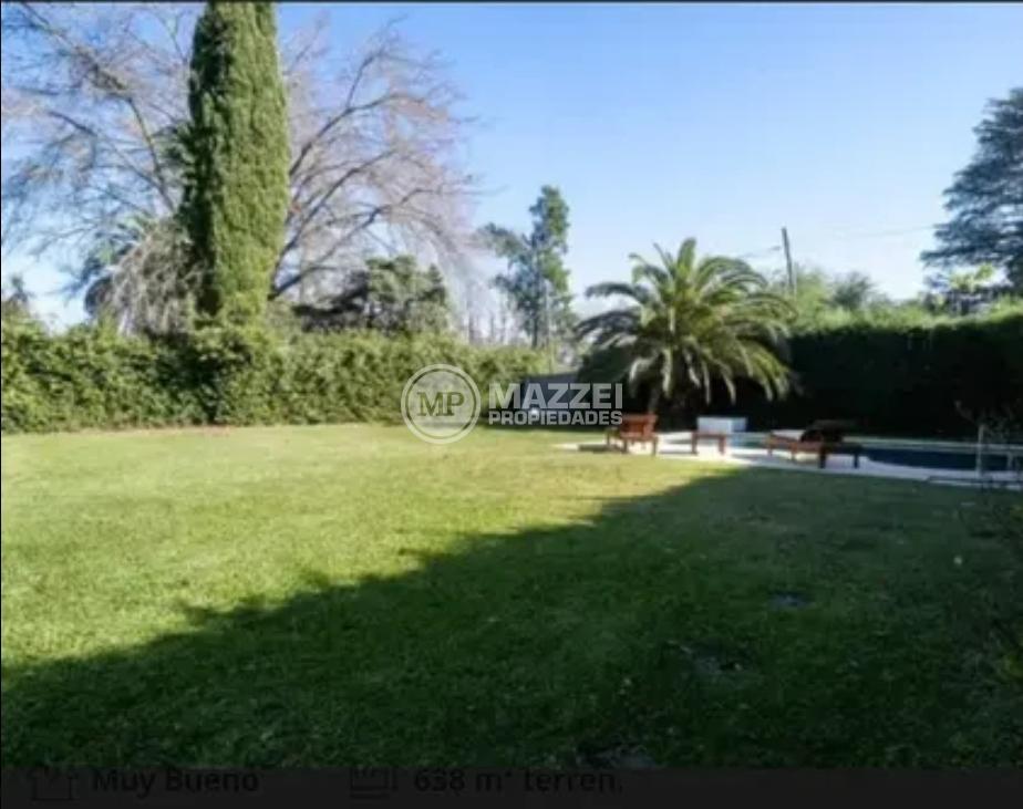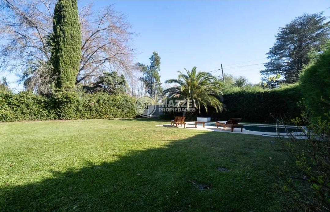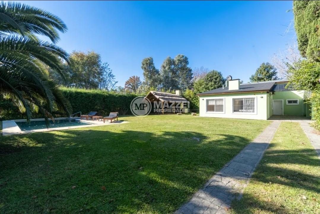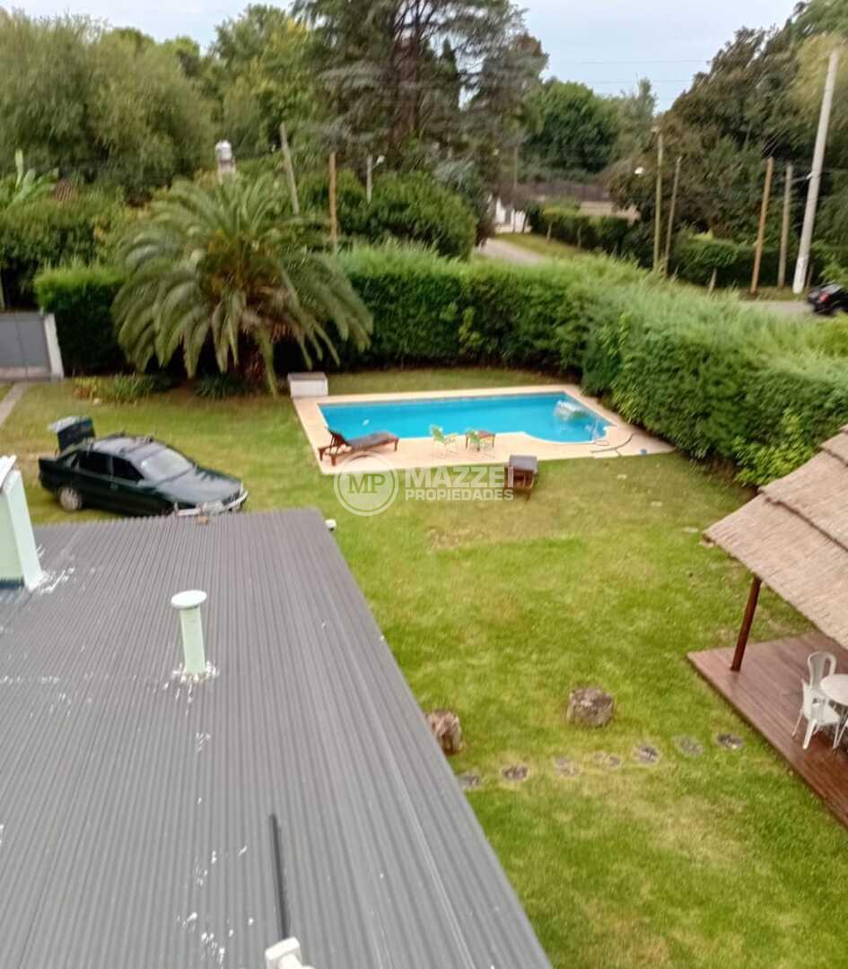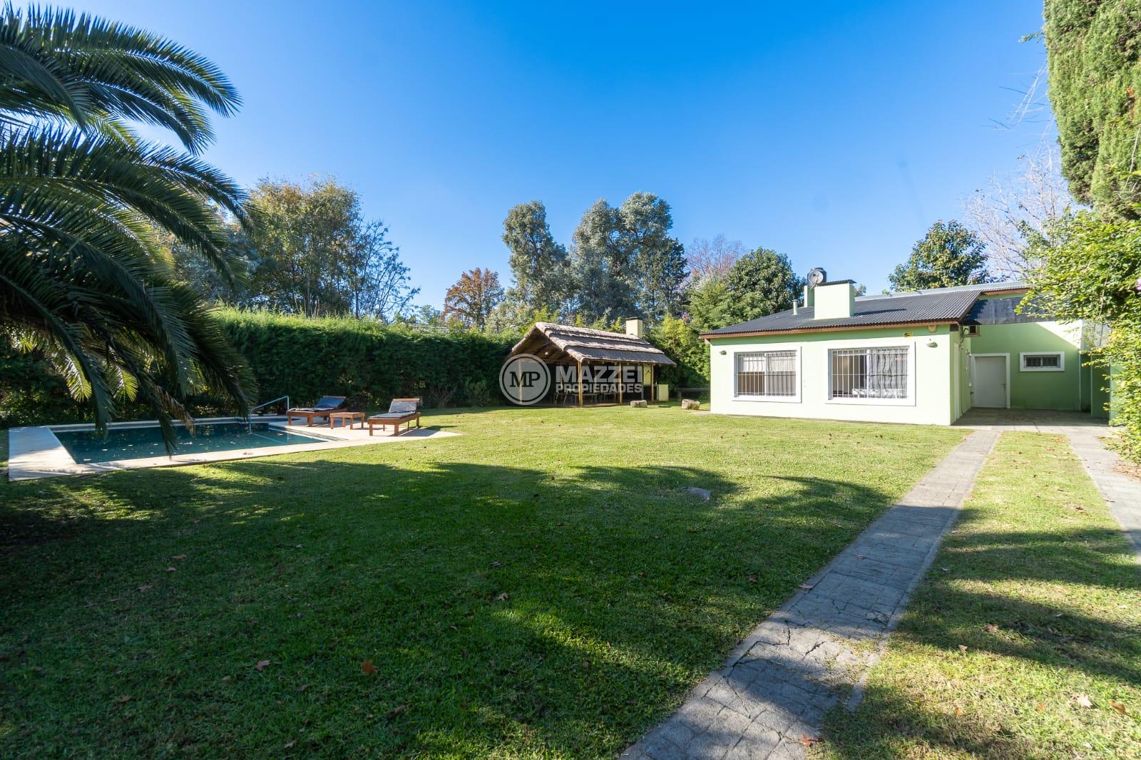 En el exterior, quincho amplio con mesa y bancos de madera, piso de deck. Piscina con bomba, filtro, solárium.