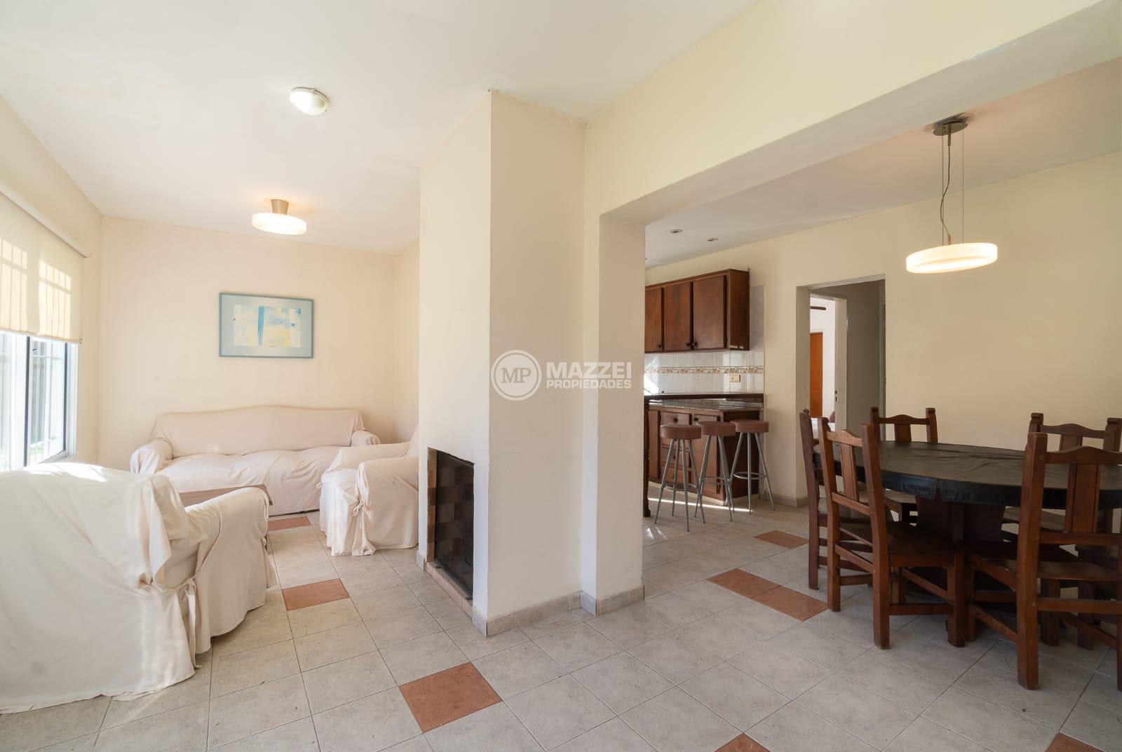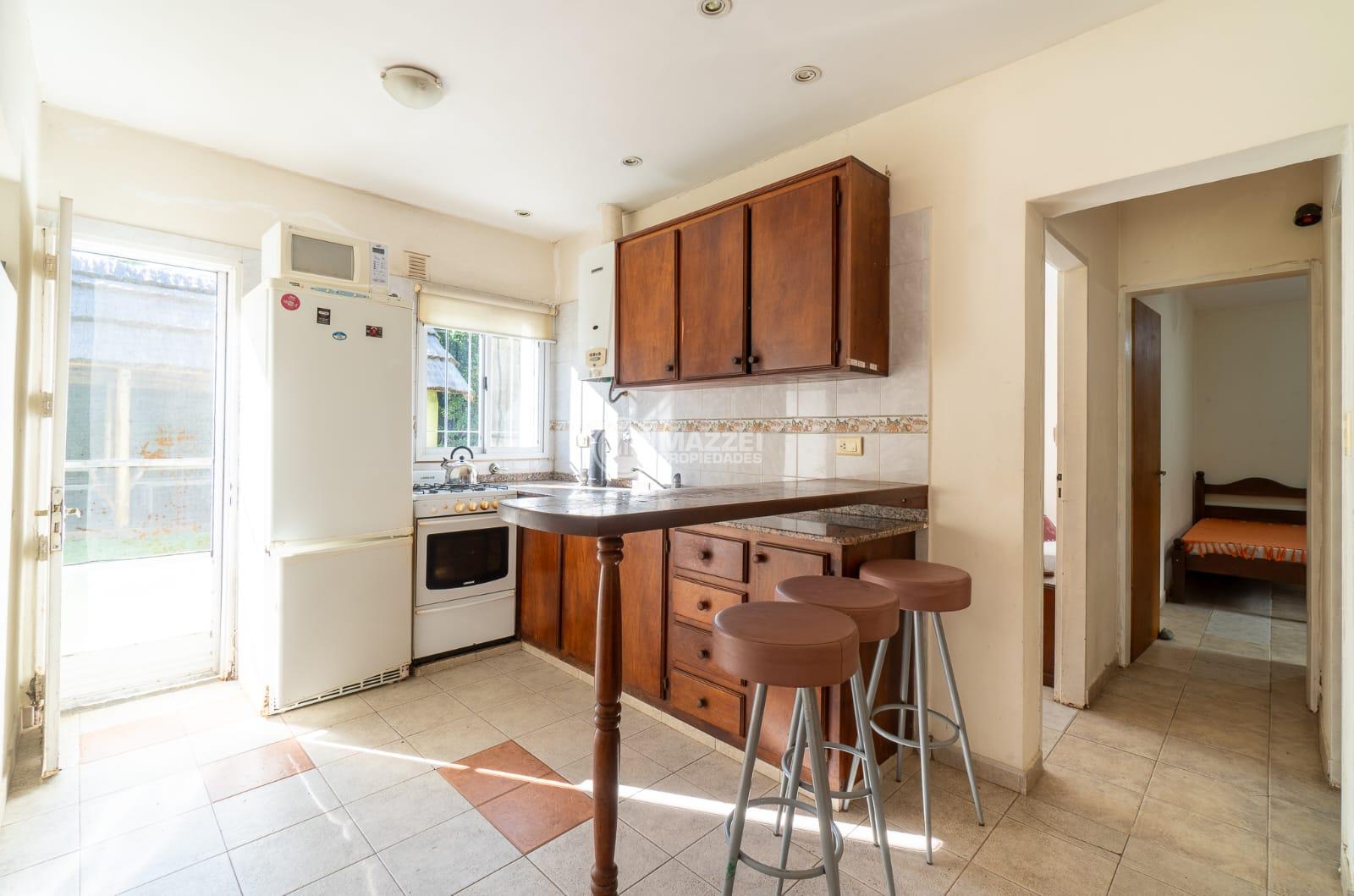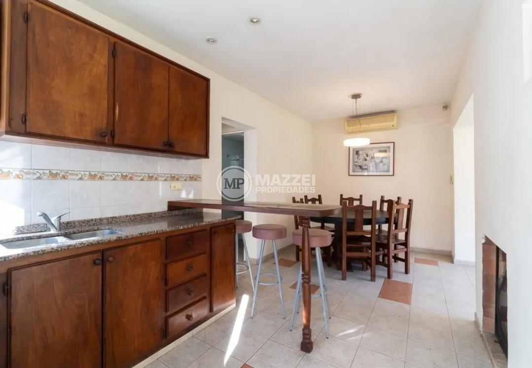Living con hogar a leña y aire acondicionado, muy luminoso naturalmente y con vista al parque. Comedor integrado a cocina completa, con mesada con bacha, alacenas, barra desayunadora, calefón a gas, ambiente muy luminoso también, puerta de salida directa al exterior.