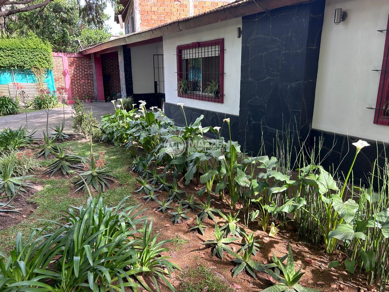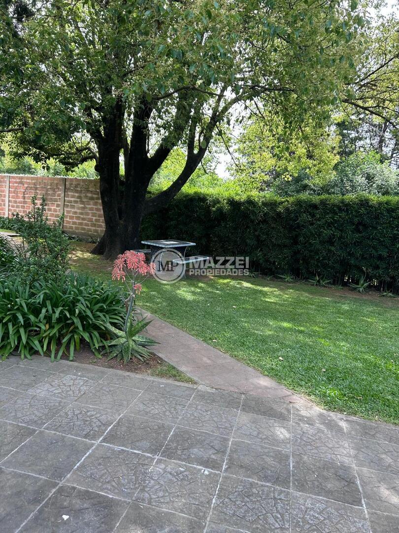 Césped en grama bahiana, jardín centro de la propiedad muy cuidado y prolijo con diversa variedad de plantas florales y arbustos.