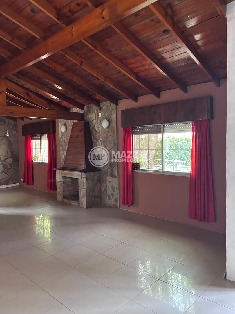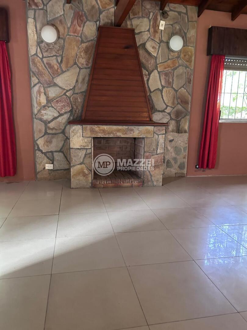 Al ingresar por la puerta principal observamos un importante hogar a leña revestido en laja. Pisos en porcelanato.
