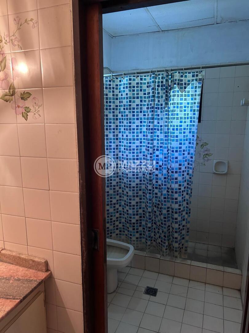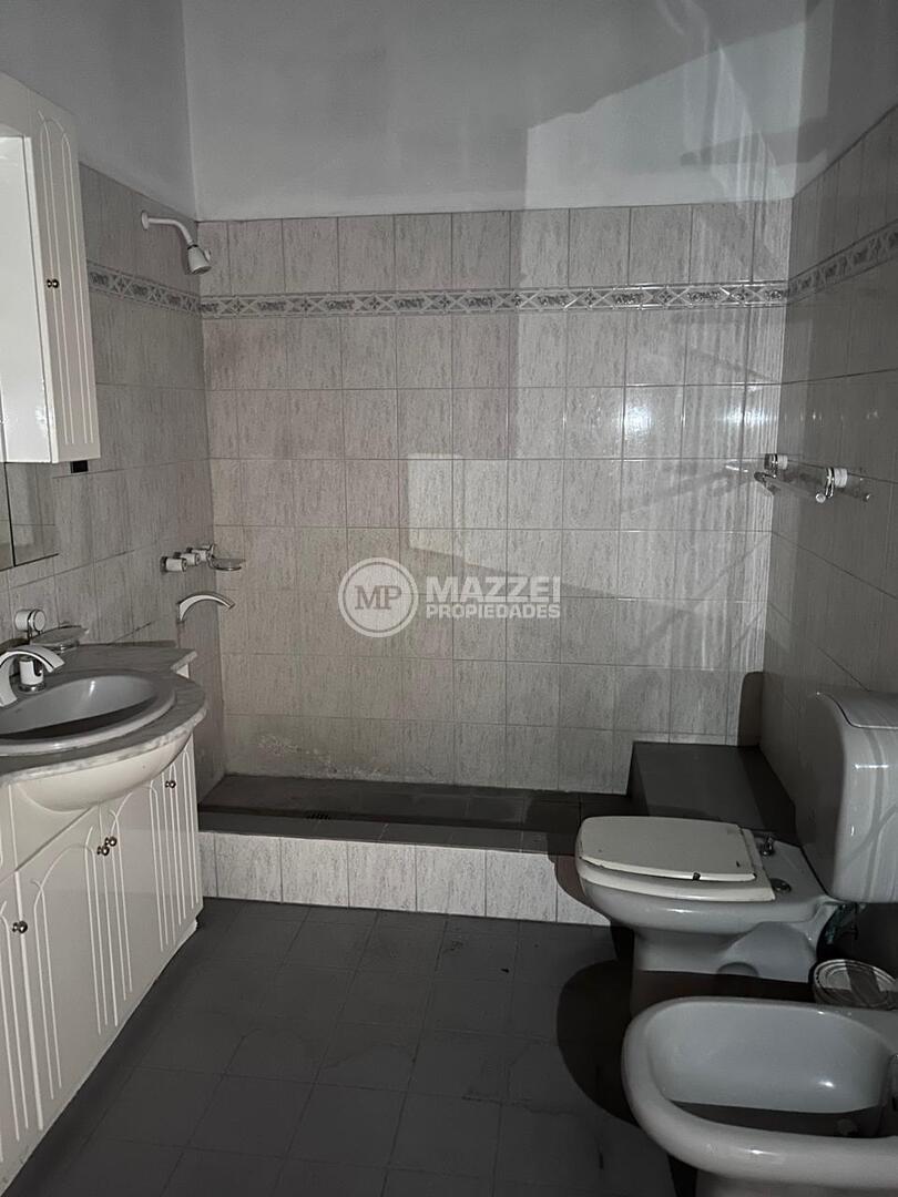 Baño completamente revestido en cerámicos, con antebaño con mesada en mármol, escalón de ducha y sanitarios en buen estado.