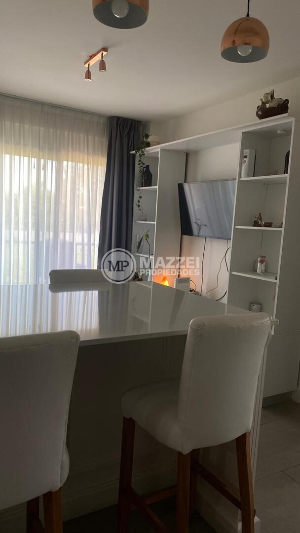 -living con mueble, sillón, Smar tv y mesa alta con 6 taburetes