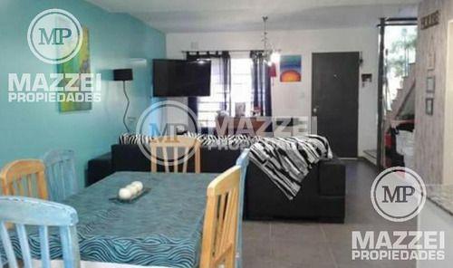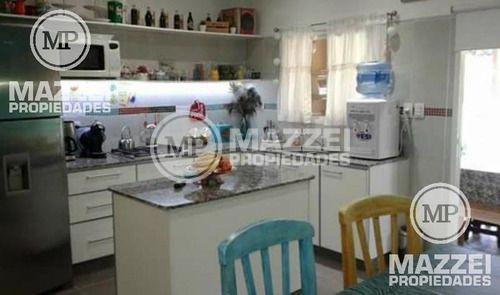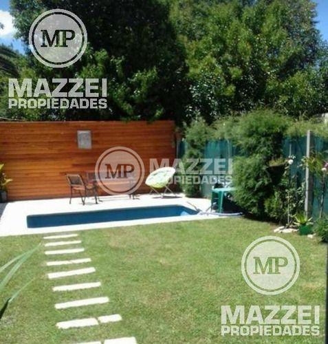 PB: Living, Comedor y cocina integrados. Toilette. Parrilla. Entrada de auto. Jardín y fondo libre. Pileta de 4x3.PA: Tres dormitorios. BañoPisos de cerámica y techo de chapa.