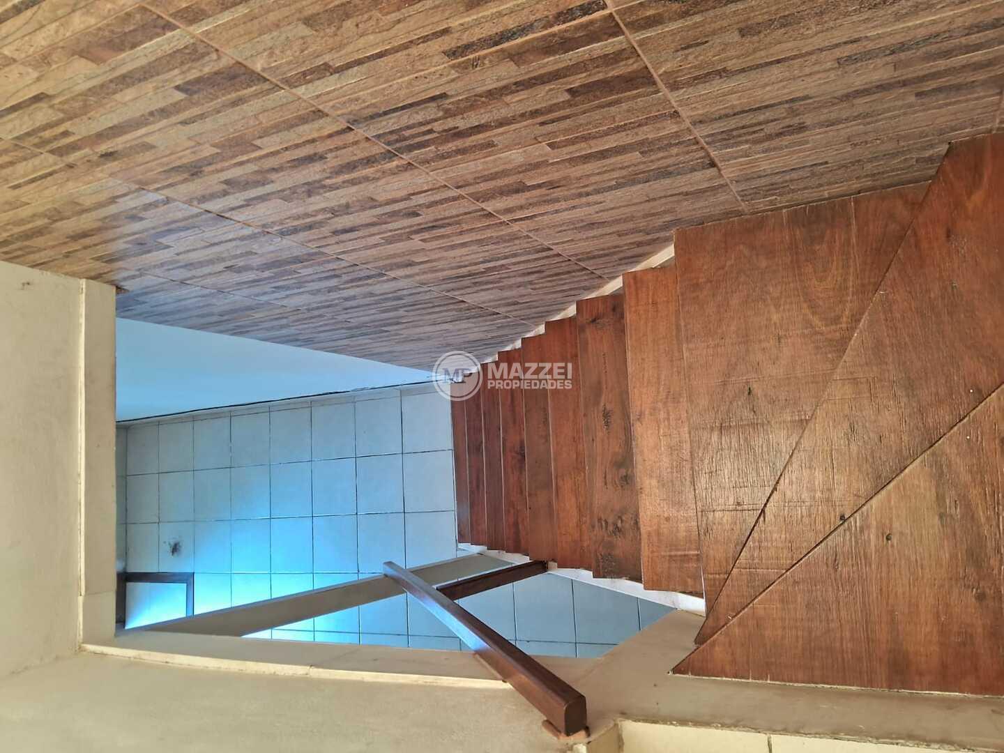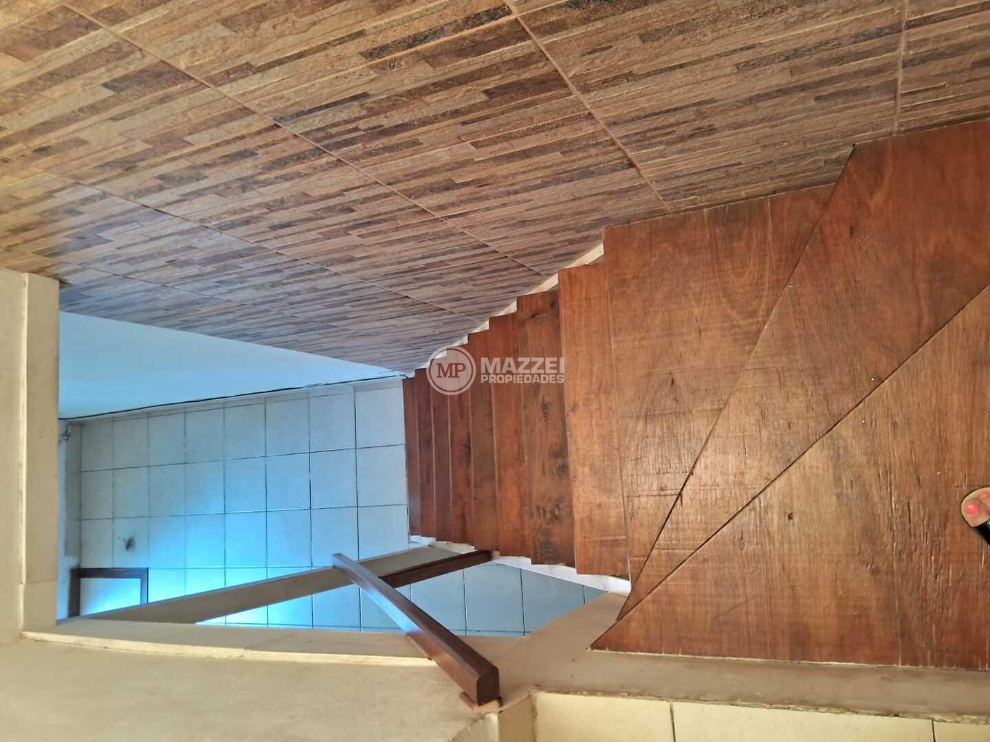 Escalera en madera para acceder a planta alta, donde hay un pasillo de distribución, dormitorio principal con placard empotrado a la pared, aire acondicionado y balcón con vista al frente, ventana balcón con postigón.