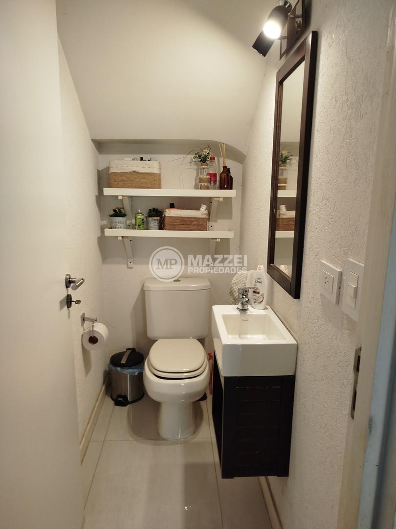 Amplio living-comedor integrado a la cocina, separados por una práctica isla. Desde este espacio se accede al jardín, que cuenta con pisos de porcelanato y espacio de guardado. Toilette de recepción.