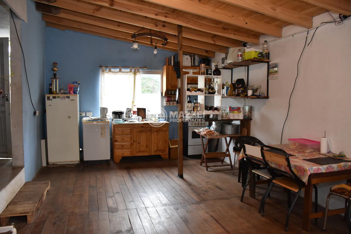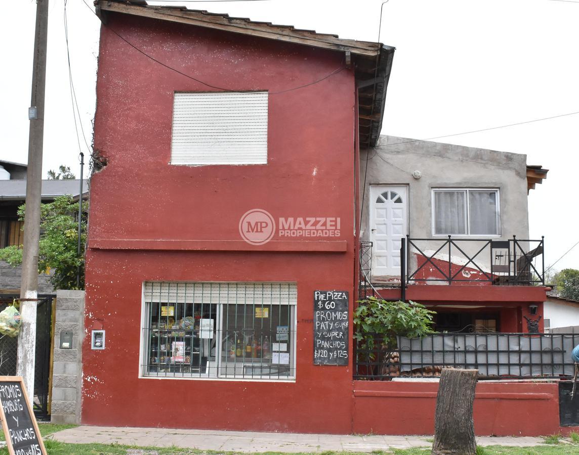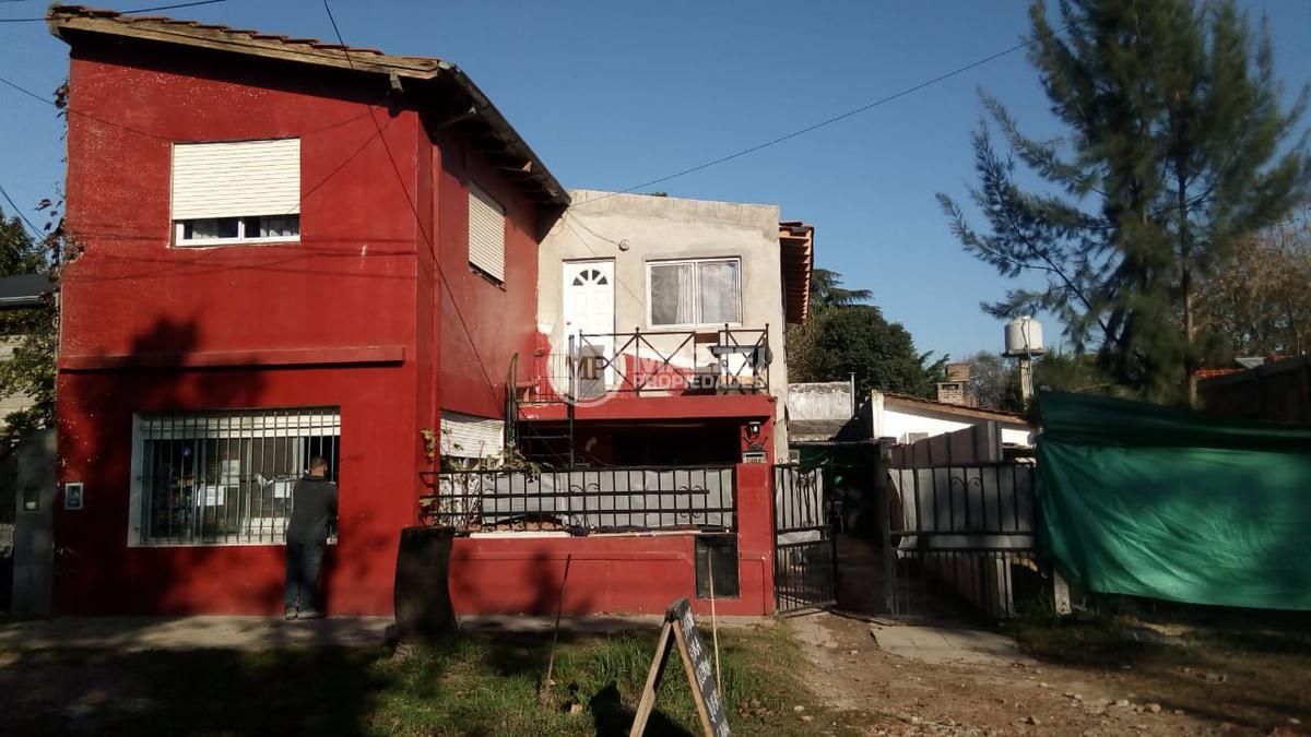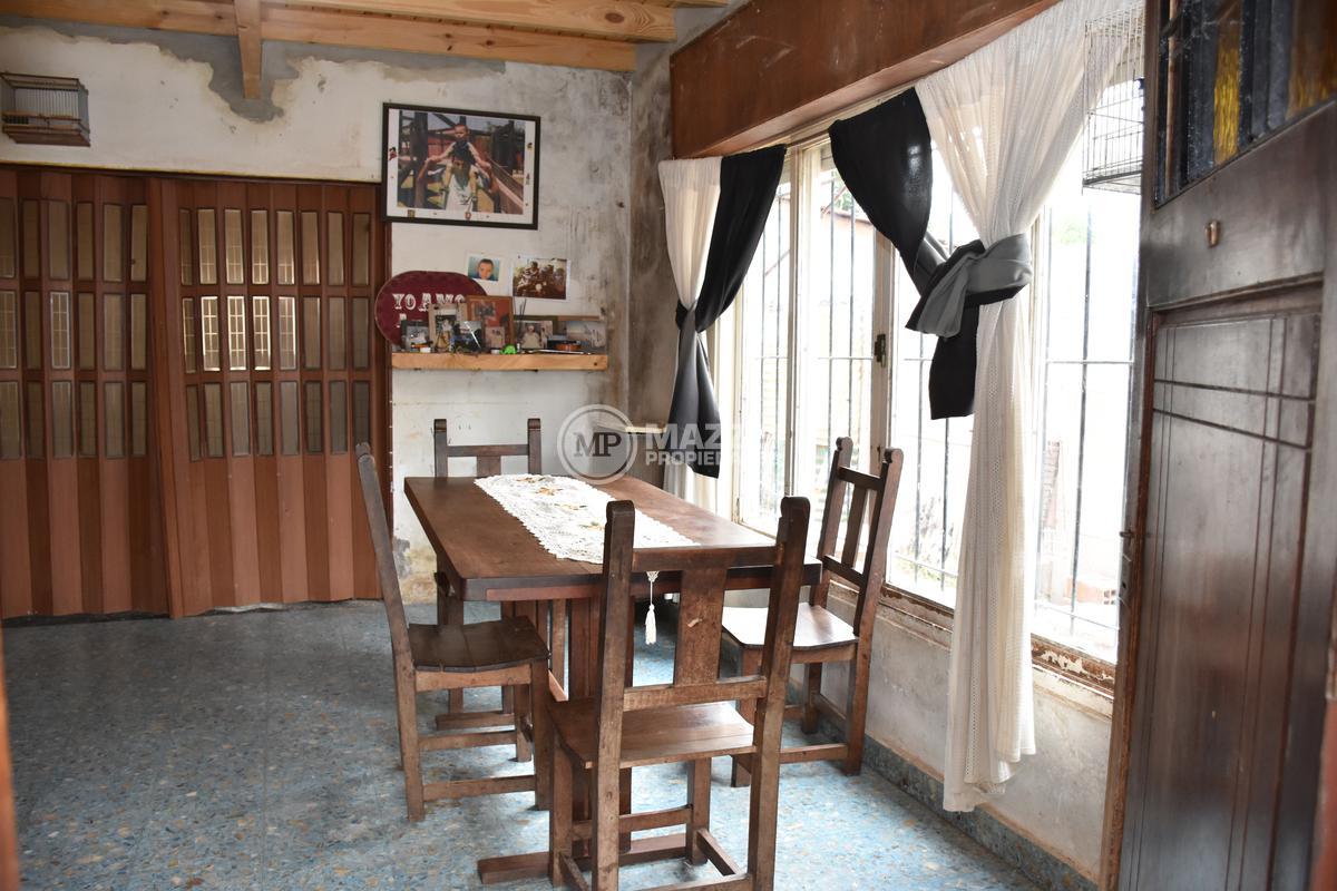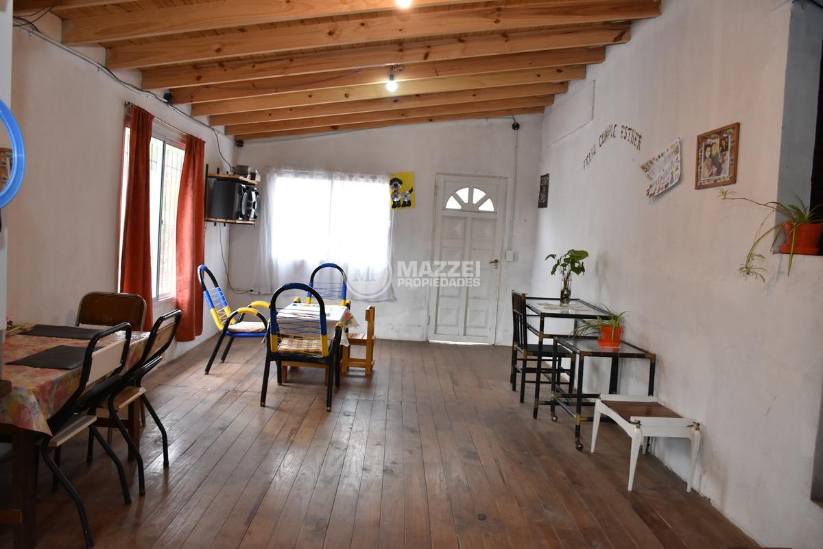 En planta baja, hall de acceso, living, integrado por puerta plegadiza a cocina comedor, la cual cuenta con mesada con bacha, mueble bajo mesada, termotanque. Dos dormitorios, uno está ubicado en el frente y tiene entrada independiente, lo que da la posibilidad de usarse también como local comercial, pasillo de distribución, baño completo con ducha. Pisos de mosaicos. Patio trasero. Dos galpones de guardado al fondo, con techo de losa.