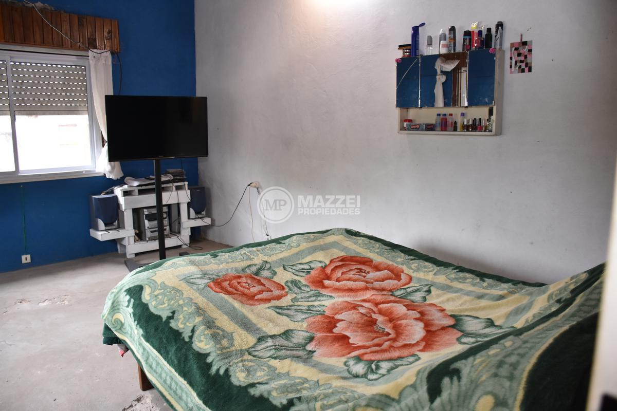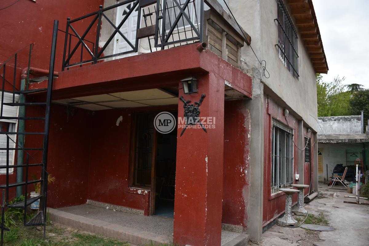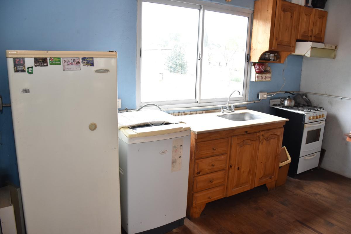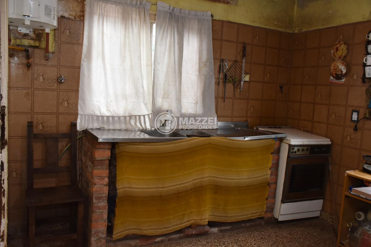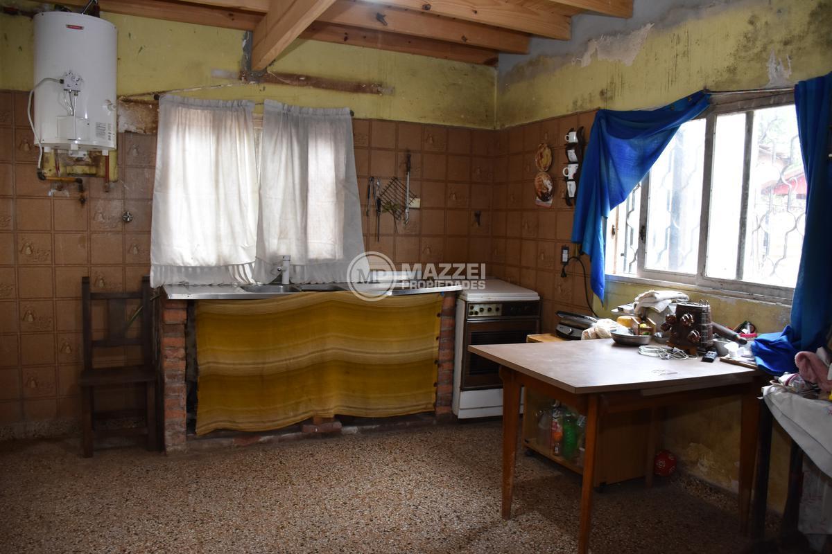En planta baja, hall de acceso, living, integrado por puerta plegadiza a cocina comedor, la cual cuenta con mesada con bacha, mueble bajo mesada, termotanque. Dos dormitorios, uno está ubicado en el frente y tiene entrada independiente, lo que da la posibilidad de usarse también como local comercial, pasillo de distribución, baño completo con ducha. Pisos de mosaicos. Patio trasero. Dos galpones de guardado al fondo, con techo de losa.