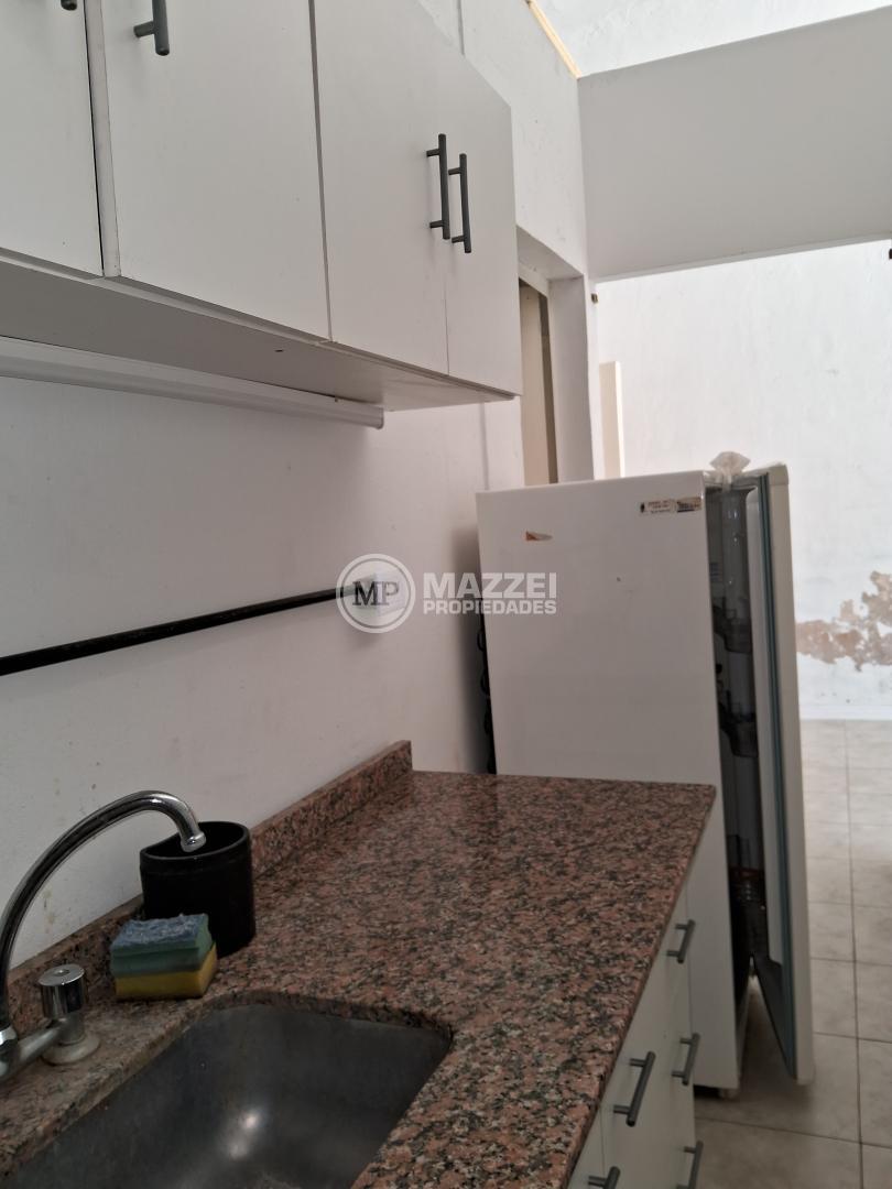 Cocina equipada con mesada con bacha, mueble bajo mesada, alacenas y heladera.