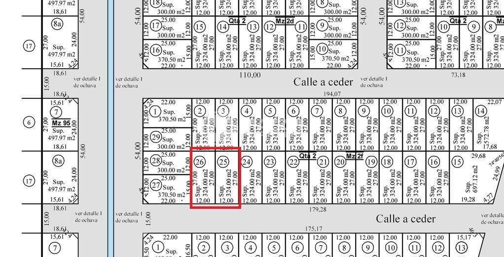 Dos lotes de 324 m² cada uno, que juntos conforman una superficie total de 648 m². Cada lote tiene un valor de U$S 14.000. Se venden de manera conjunta por U$S 28.000 o por separado.